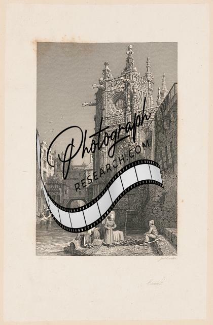 Caen, Print shows a canal with women washing clothing on a small quay and a view of the rear of the Church of Saint Pierre in Caen, France, with bird-shaped gargoyles at top.