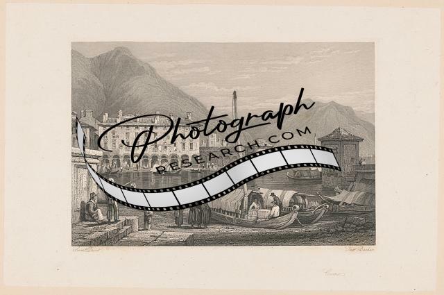 Como, Print shows a view of the port on Lake Como, with boats and buildings, and with men standing on the shore in the foreground, at Como, Italy.
