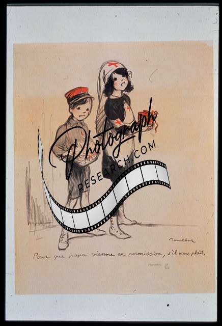 Summary: A young girl in a Red Cross nurse's uniform and a small boy wearing a red cap, carrying a collection cup and selling medals - 'So that Papa may come on leave, if you please.'