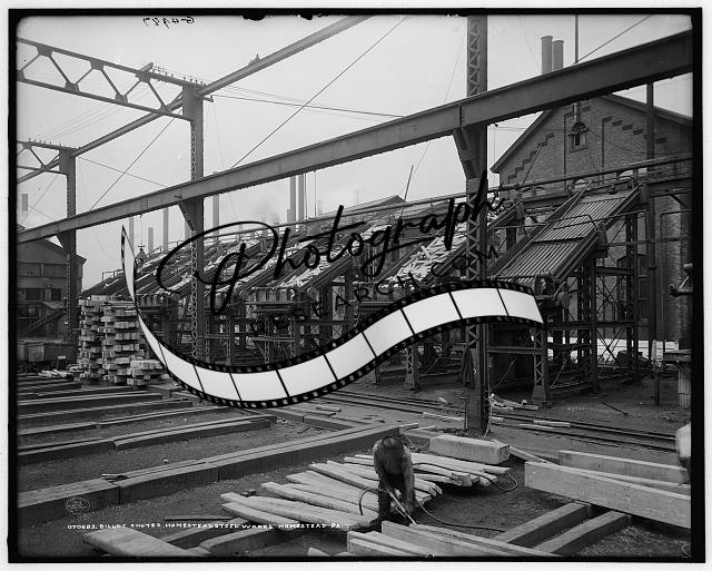 Steel ingots,Homestead Steel Works,industrial buildings,cars,Pennsylvania,1900