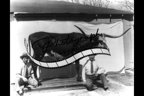 The Texas longhorn steer,2 men seated with steer on platform,c1932,TX