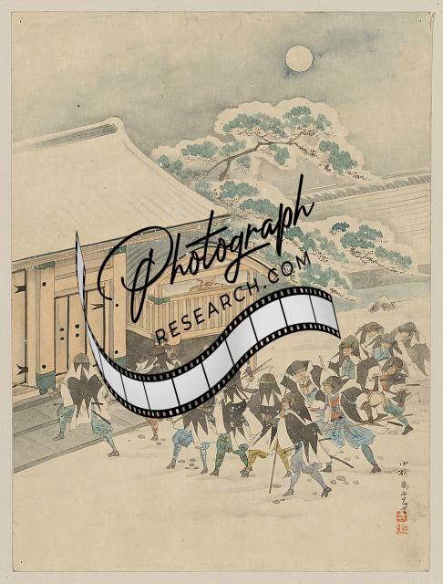 Summary: Print shows a scene during the attack on Kira Yoshinaka's home by the 47 ronin, with two men about to engage in combat inside a dwelling, disrupting a woman playing the koto and knocking down partitions.