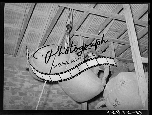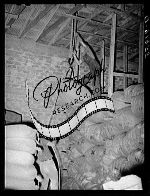 Title: Sacks of wool and mohair in storage at the Kimble County Wool and Mohair Company Warehouse, Junction, Texas