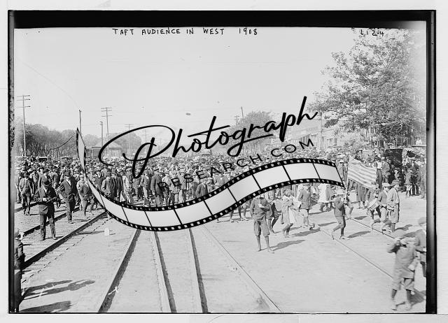 William Howard Taft crowd on railroad tracks in West,1908,RR tracks,US Flag