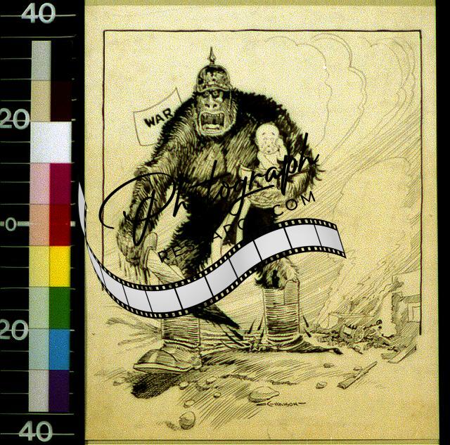 Raging ape of war with bloody sword carrying crying baby of 1915,World War I,WWI