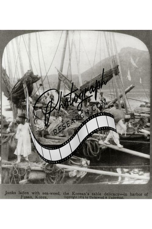 Title: Junks laden with sea-weed, the Korean's table delicacy - in harbor of Fusan, Korea