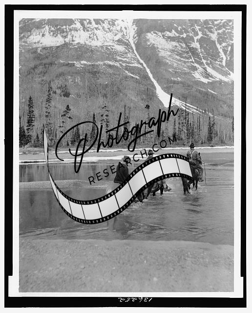 Three campers,riding,mountains,horseback cross Columbia River,Washington,WA,1903