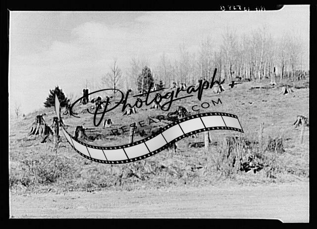 Title: Rotting logs and stumps left by the first exploitation of virgin timber (white pine). It was a common practice to use only the part of the tree to the first limb, the rest was left to rot. In most cases this resulted in wastage of about two thirds. On K Highway, Forest County, Wisconsin