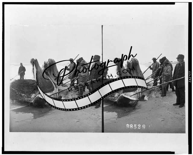 Men and two large pieces of whale on shore, 1908