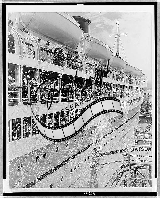 S.S. LURLINE leaving Honolulu,Hawaii,Passengers,Leis,1935,Serpentine,Ocean Liner