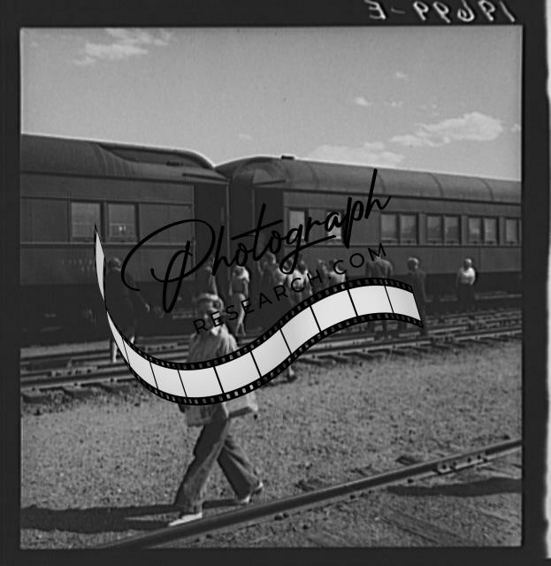 Title: Railroad yards, Kearney, Nebraska. Overland train passengers go back to their cars after ten minute train stop on trip between San Francisco and Chicago