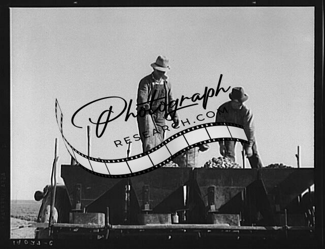Title: Loading bins of potato planter with fertilizer and seed from trailer at edge of field. Kern County, California