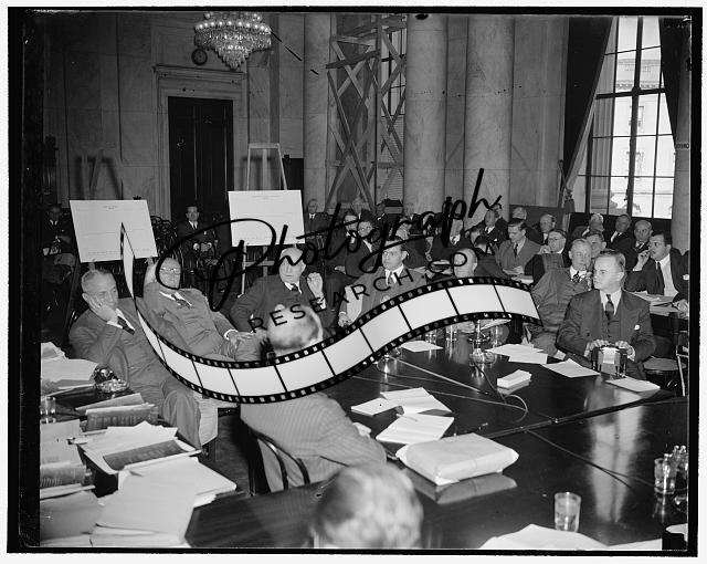 Title: House and Senate conferees agree on final draft of neutrality bill. Washington, D.C., Nov. 3. Chairman of the Senate Foreign Relations Committee, Key Rittman, sitting, and Rep. Sol Bloom, standing Chairman of the House Foreign Relations Committee, as they outlined to reporters the final draft of the Neutrality Bill repealing the arms embargo as agreed upon by House and Senate conferees