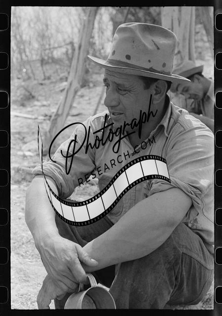 Title: Professional goat and sheep shearer moving kettle closer to the coals while he cooks the noonday mean on the ranch of a rehabilitation borrower in Kimble County, Texas