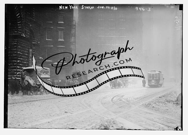 Horse-drawn wagons on snowy street,NY snow storm,New York,1910,trolley car,snow