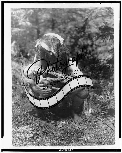 Kwakiutl man? crouched,cradling mummy bound in fetal position,c1911,Indian