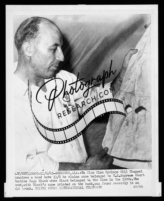 Ku Klux Klan Cyclops Bill Chappel examining a hood he claimed once belonged to US Supreme Court Justice Hugo Black when Black belonged to the Klan in the 1920s, Anniston, Alabama