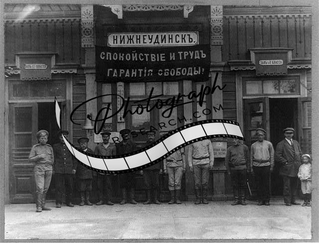 Group,railroad officials,Russian banner,freedom,Trans-Siberian Railroad,c1918