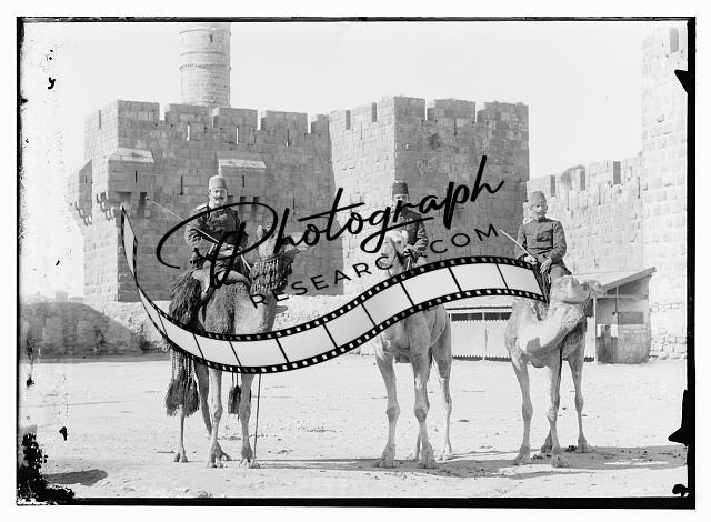 Turkish officers on camels before Tower of David,Jerusalem,Israel,Middle East