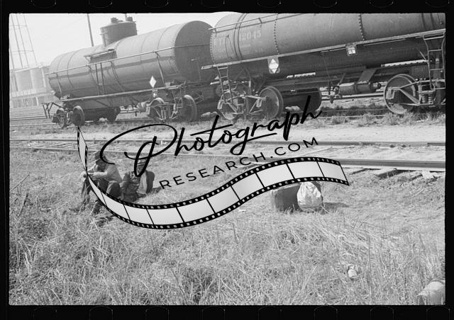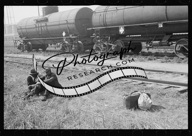 Man seated by train tracks,Railroad,RR,Farm Security Administration,FSA,3