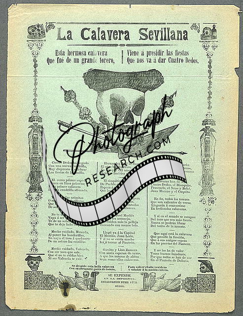 PGA - Vanegas, no. 89 is a similar broadside. However, it contains different borders and different small male heads and figures and a small skeleton on a balance. The text and the central plate image are the same for both.