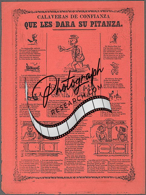 Summary: Broadside shows a skull decorated with the implements and costume of bullfighting. Small skulls and skeletons decorate the borders. The text in calavera verse conveys a listing of the better known bullfighters in Mexico which Cuatro Dedos (Four Fingers) is presenting.
