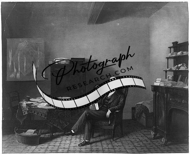 Lee's Study,man seated at table full of books and paper,basket,desk
