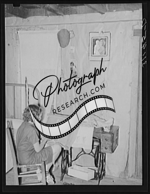 Title: Southeast Missouri Farms. Sharecropper's daughter sewing in combination living room/bedroom of shack home. La Forge project, Missouri