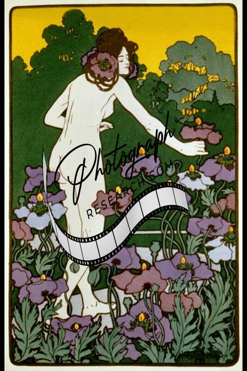 L'heure du berger / Hans Christiansen,1898?,Nude woman picking poppy,flower bed