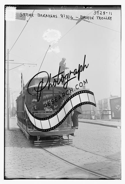 Strike breakers,1916 -- broken trolley,transportation,Bain News Service