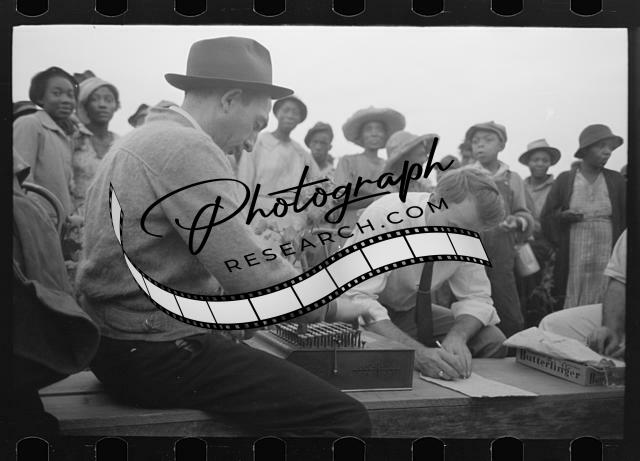 Title: Recording weights of cotton picked by day laborers, Lake Dick Project, Arkansas