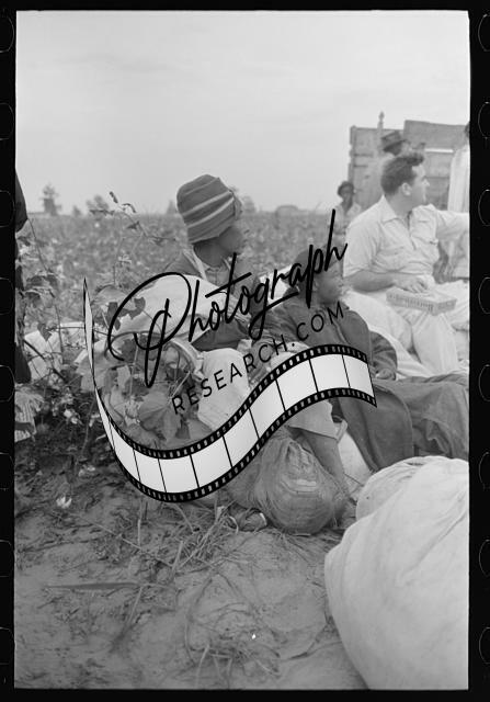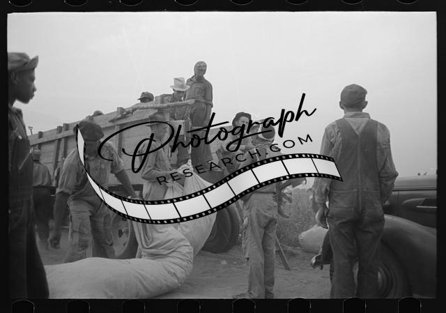 Title: Day laborers, cotton pickers, waiting to be paid off at end of day's work. Lake Dick Project, Arkansas