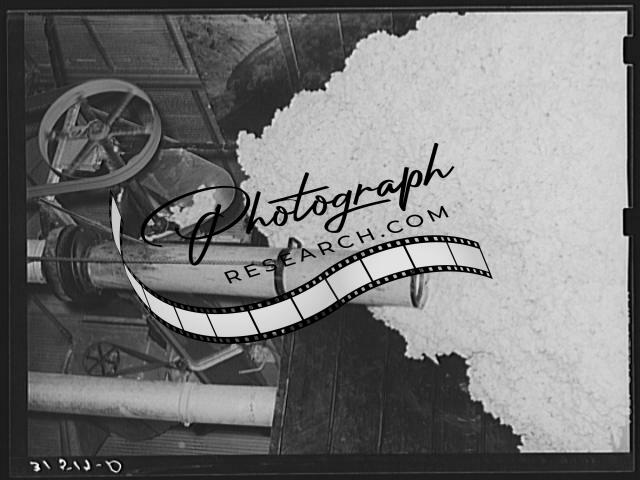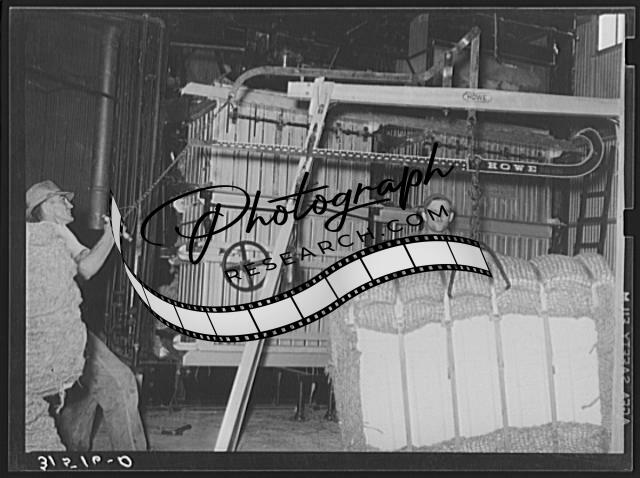 Title: Cotton in process of ginning. After being cleaned it is dropped into position to be baled. Lake Dick Project, Arkansas