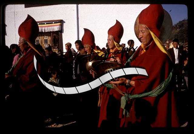 Title: [Lamas blowing horns at New Year's ceremony, Gangtok, Sikkim]