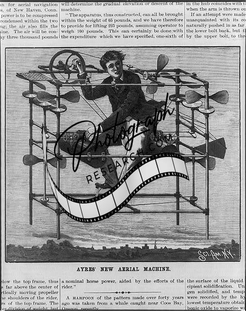 Ayres' new aerial machine,Man in hand & foot powered flying machine,May 1885