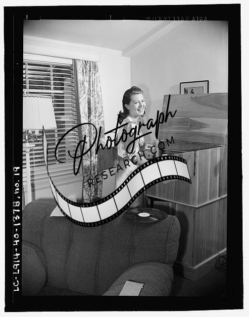 Lana Turner,stereo system,record albums,Beverly Hills home,CA,E Thiesen,1940