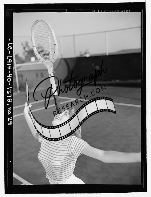 Lana Turner posing,tennis court,racket,Beverly Hills,CA,E Thiesen,1940 1