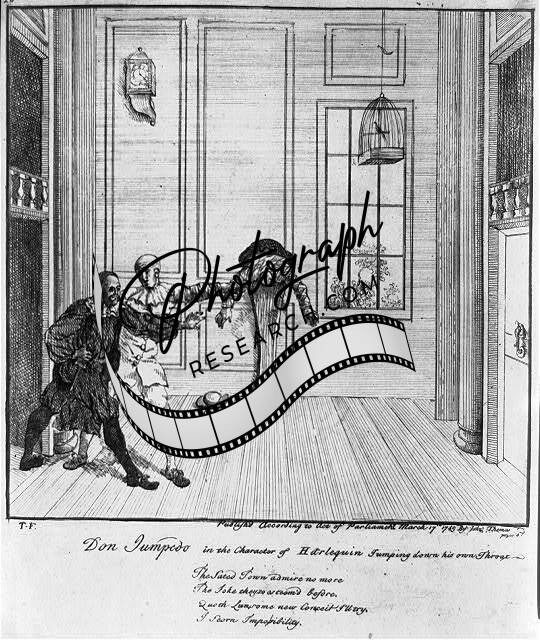 Don Jumpedo in Character of Harlequin,British Cartoon,1749,Pedestal,Throat