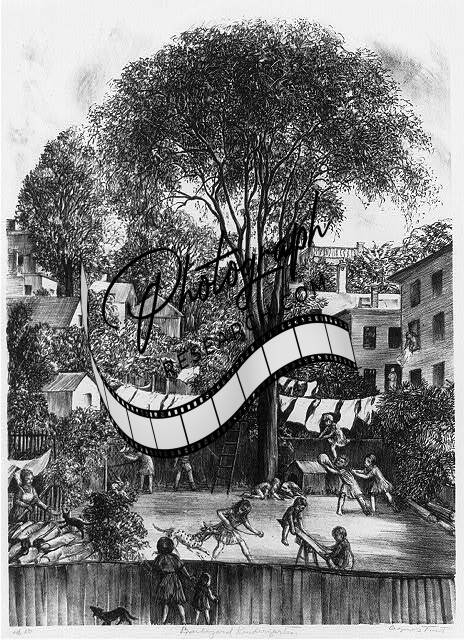 Backyard kindergarten. Group of children playing in backyard., Tait, Agnes, 1894-1981, artist