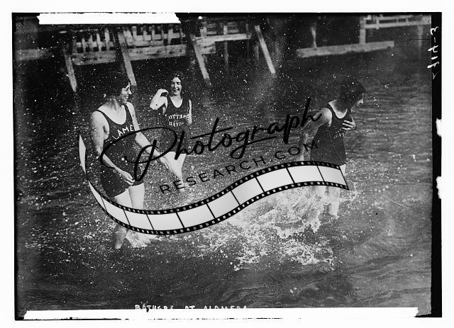 Bathers at Alameda,girls,bathing suits,splashing,1910-1915,water,smiling