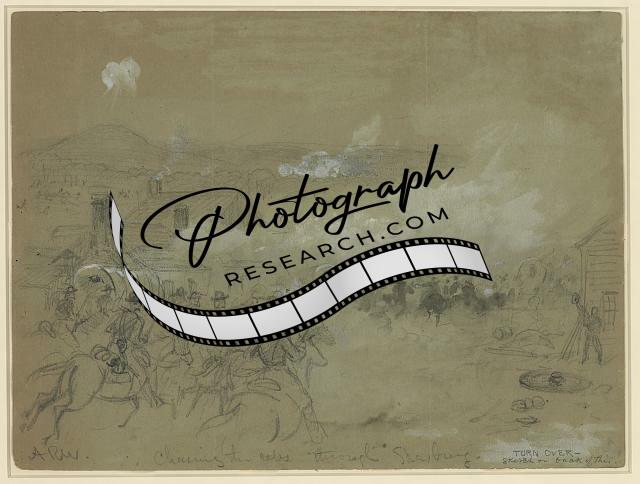 Inscribed on verso: The last charge at the Battle of Five Forks, April 1st 1865. a sor[r]el (?). Here Warren made his last charge. his horse was shot under him. the rebels had surrendered and were massed about the tree depicted (?) in the sketch when an aide of Sheridans came up and relieved Genl. Warren from command. Of course if this had not been done, Warren would have had the credit of the victory he had justly won. Sheridan and the ring he belongs to intends to grab all laurels no matter at the cost of what injustice. ARW