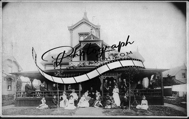 27 men,women,Johnston family,front,beach house,Dartmouth,porches,outdoors,c1880