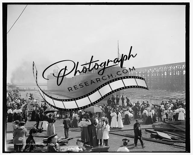 Launch SS WE Fitzgerald,cargo ship,freighters,crowds,Wyandotte,Michigan,MI,1906