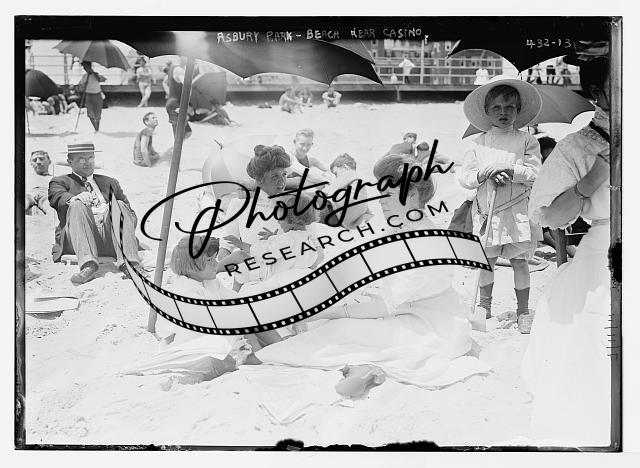 On beach,near Casino,Asbury Park,July 1908,umbrellas,children,sand