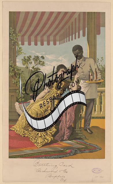 Print shows a woman reclining in a chair on the veranda of a resort with a distant view of a mountain lake; an African American man, on the waitstaff, is delivering a drink to her.