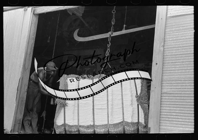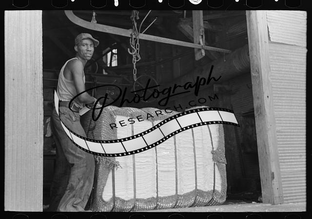 Title: Putting steel straps in place to hold pressed cotton after pressure has been removed, Lehi, Arkansas cotton gin