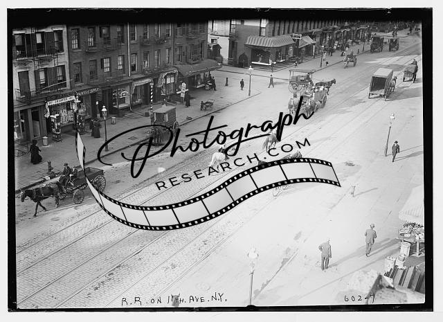 Train tracks,horse-drawn carts,11th Avenue,New York City,NYC,pedestrians,stores