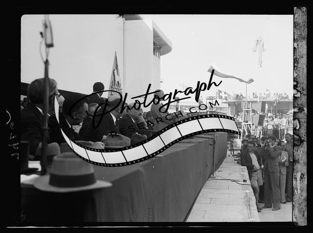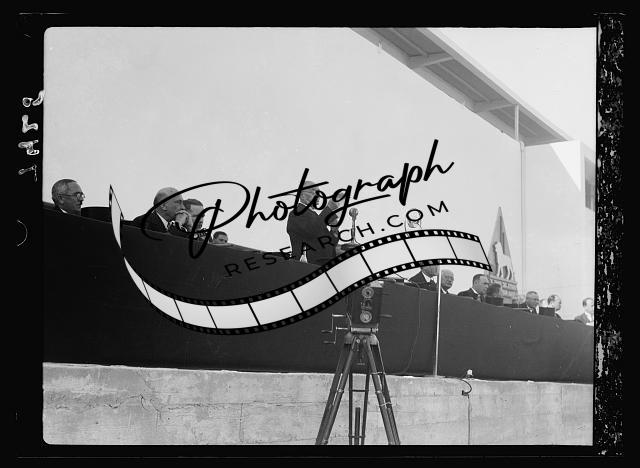 Title: Opening of Levant Fair. Tel-Aviv Ap[ril] 30, 1936. At the dias. Dr Weizman [i.e., Weizmann] Dizengoff, Sir Arthur Wauchope, etc.