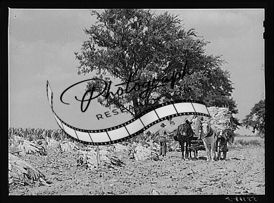 Title: Farmers cutting tobacco and putting it on sticks to wilt before taking it to barn for drying and curing. In region between Louisville & Lexington, Kentucky
