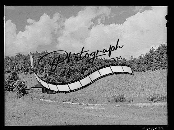 Title: Cornfield with tobacco barn in background on Russell Spear's farm near Lexington, Kentucky